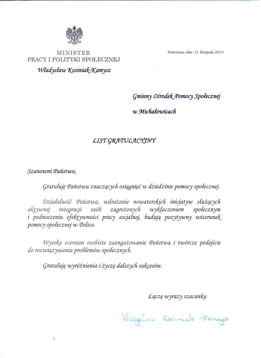 W roku 2013 wpłynęło 140 wniosków o nagrody w tym 58 wniosków w kategorii indywidualnej oraz 82 w kategorii zespołowej. Minister Pracy Ii Polityki Społecznej przyznał 14 nagród pieniężnych w tym 7 indywidualnych i 7 zespołowych oraz 15 wyróżnień w formie listów gratulacyjnych w tym 7 indywidualnych i 8 zespołowych za wybitne i nowatorskie rozwiązania w zakresie pomocy społecznej. W gronie osób nagrodzonych znalazła się Pani Katarzyna Dąbek straszy specjalista pracy socjalnej w GOPS Michałowice, natomiast w gronie wyróżnionych zespołów znalazł się cały zespół pracowników GOPS Michałowice.